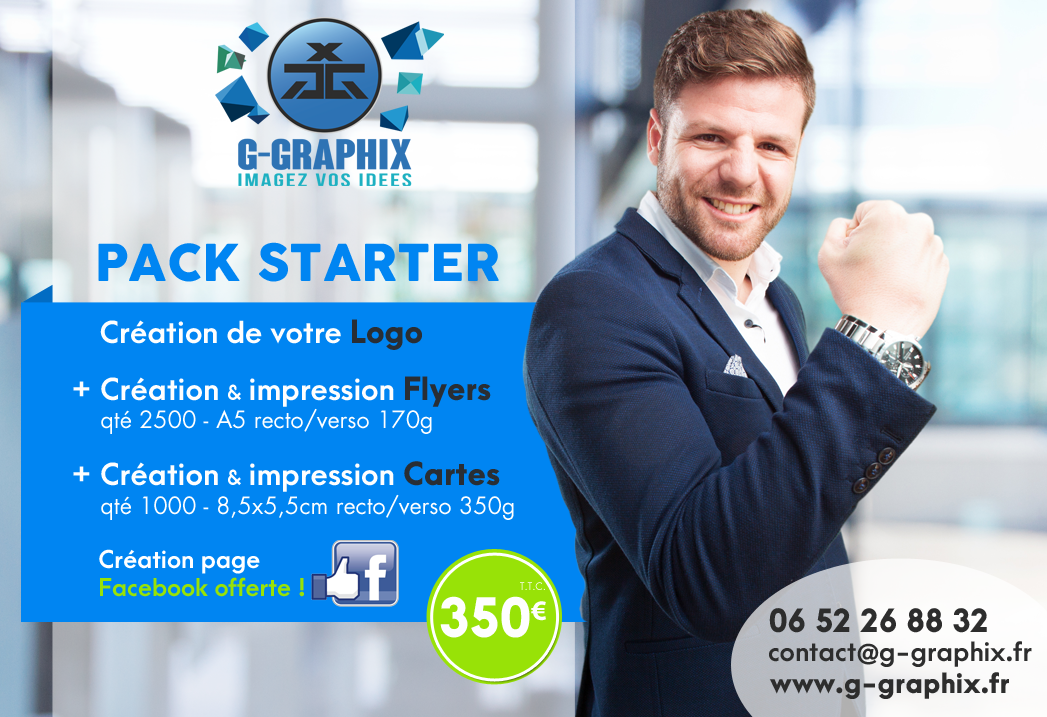 Le pack STARTER ! La qualité sans vous ruiner. Création de votre logo, flyers, cartes de visite et page Facebook offerte ! Attention durée limitée !